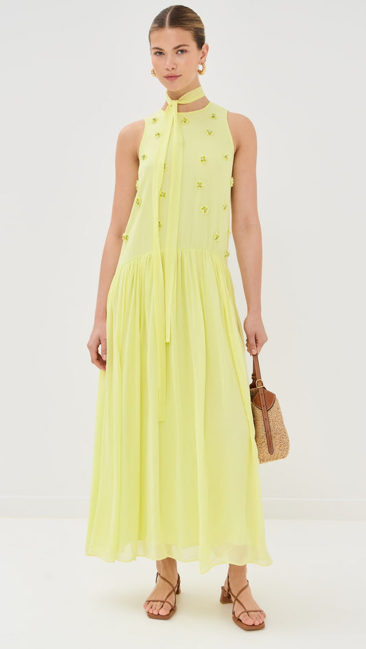EMBELLISHED HALTER NECK BOX PLEATED DRESS