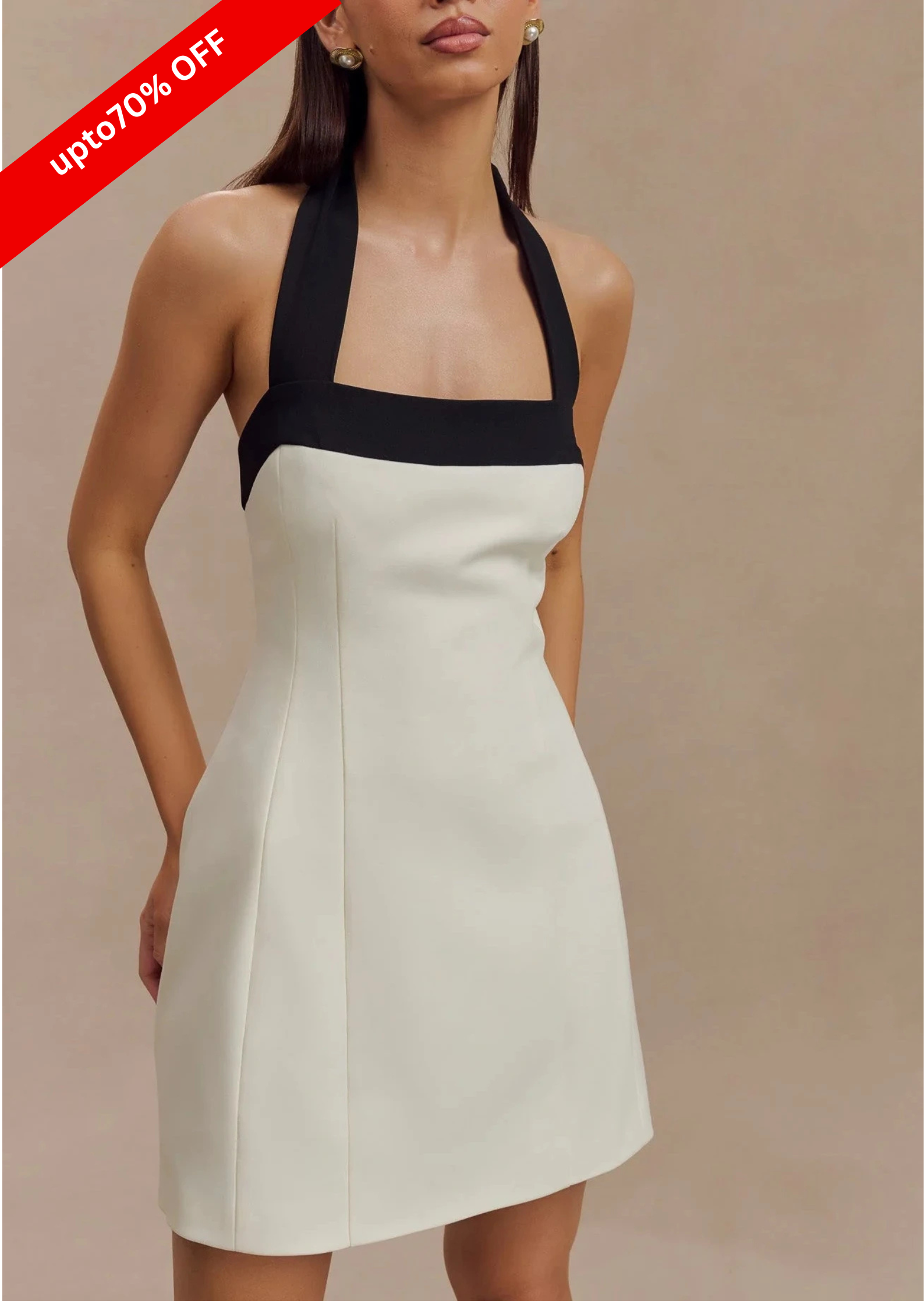 The Contrast Suiting Mini Dress is a sophisticated blend of modern elegance and chic design. Featuring a halter neckline and a fitted bodice, this dress accentuates your figure with its sleek, tailored shape. The flared skirt creates a playful yet refined silhouette, while the contrast top panel and neck straps add a stylish, contemporary touch. With a centre back zip closure for a secure fit and a fully lined interior for added comfort, the Cara Dress is perfect for making a polished statement at any event or special occasion.