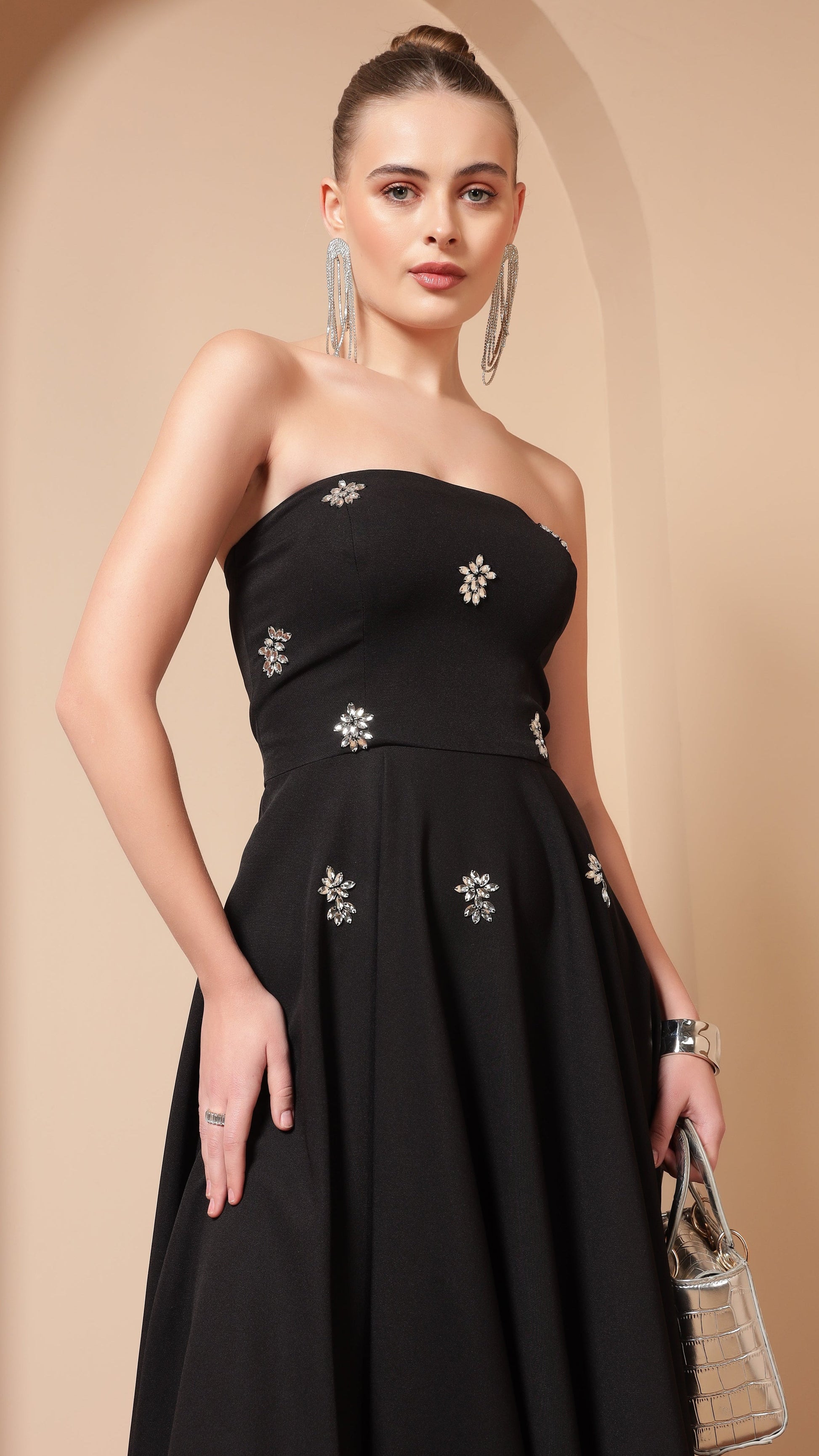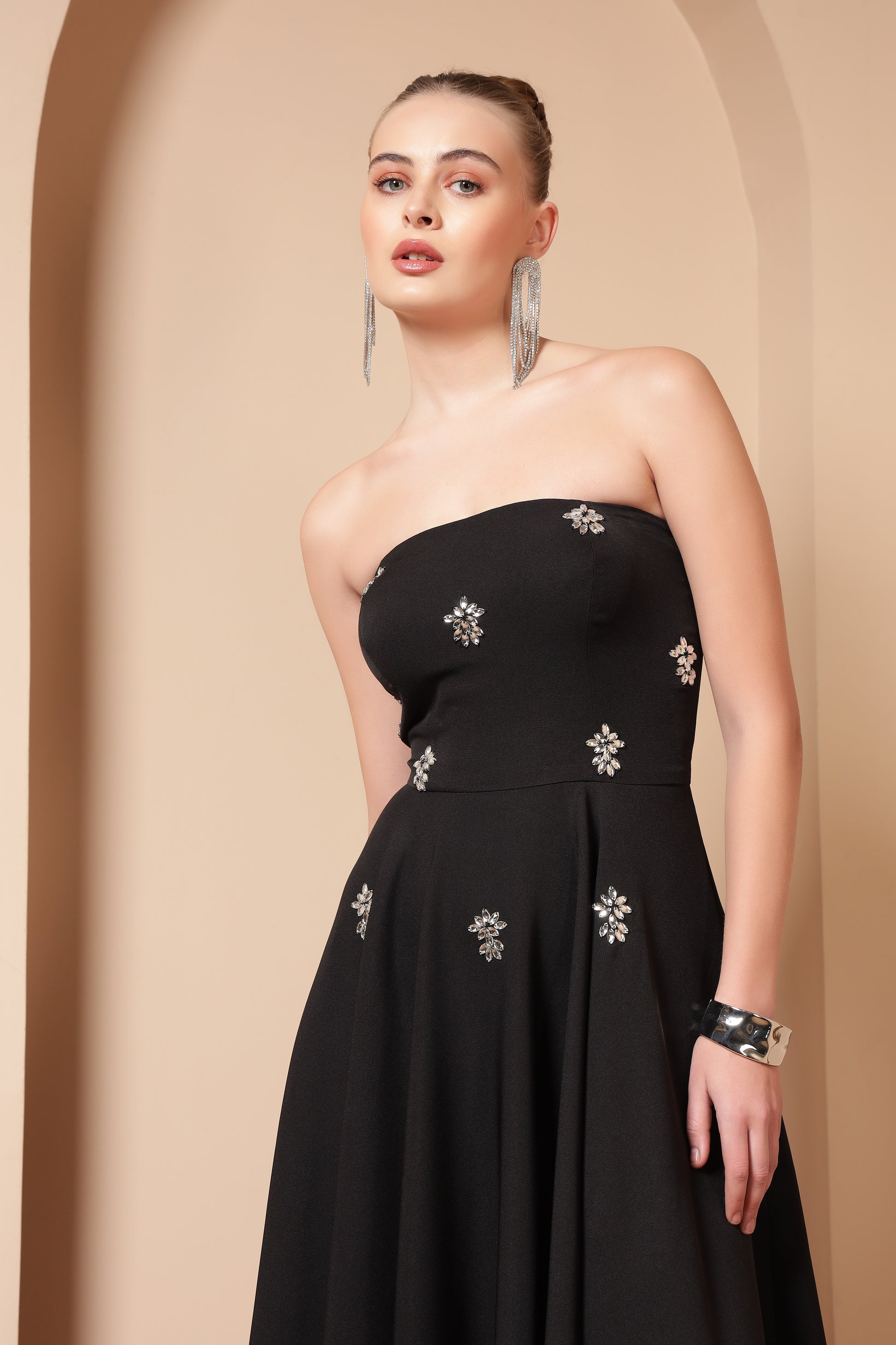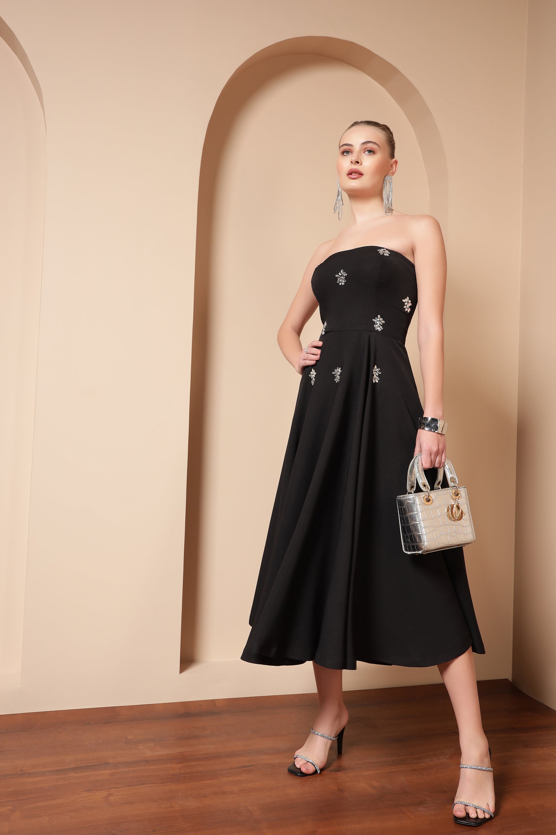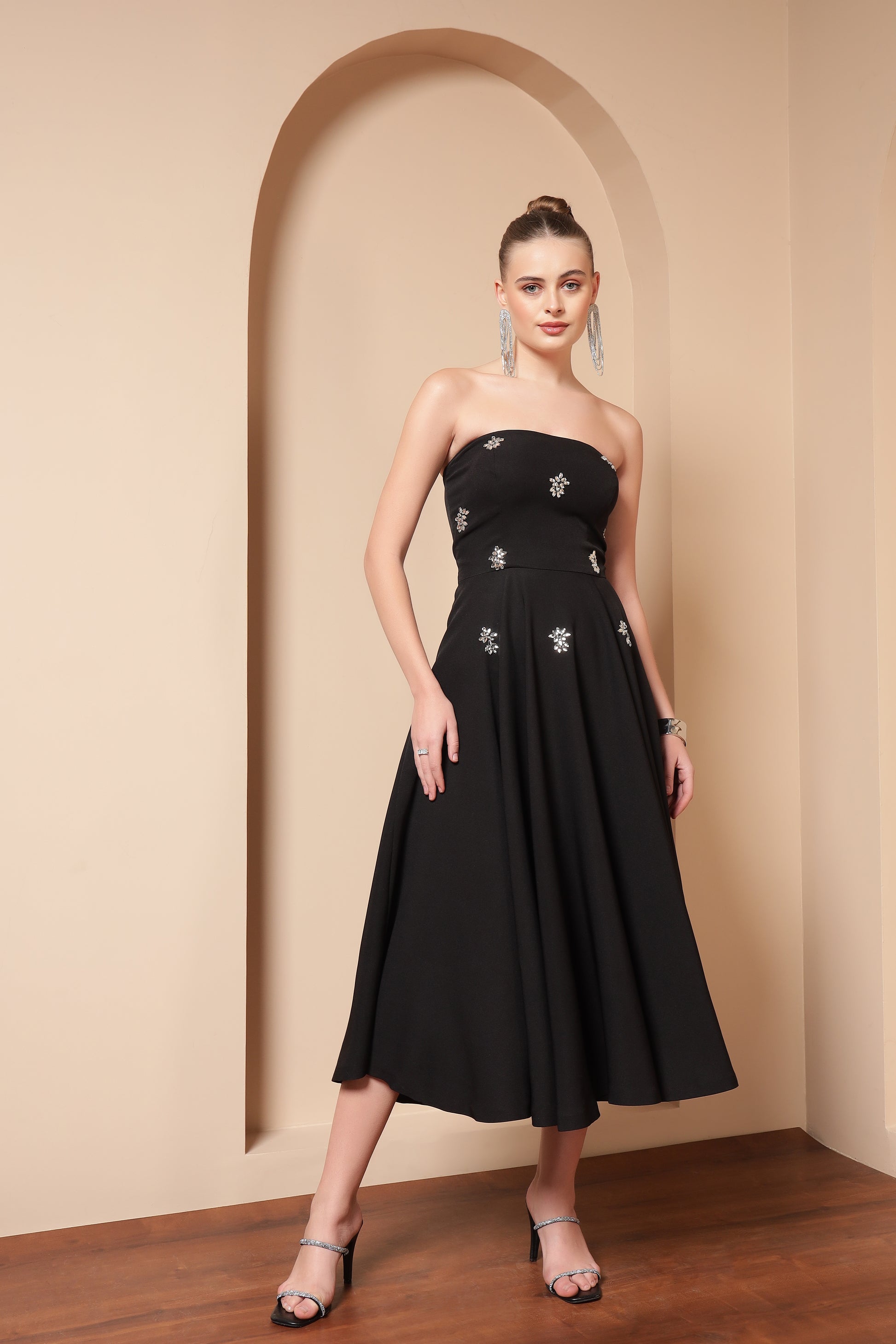 CRYSTAL EMBROIDERED FLARE MIDI DRESS