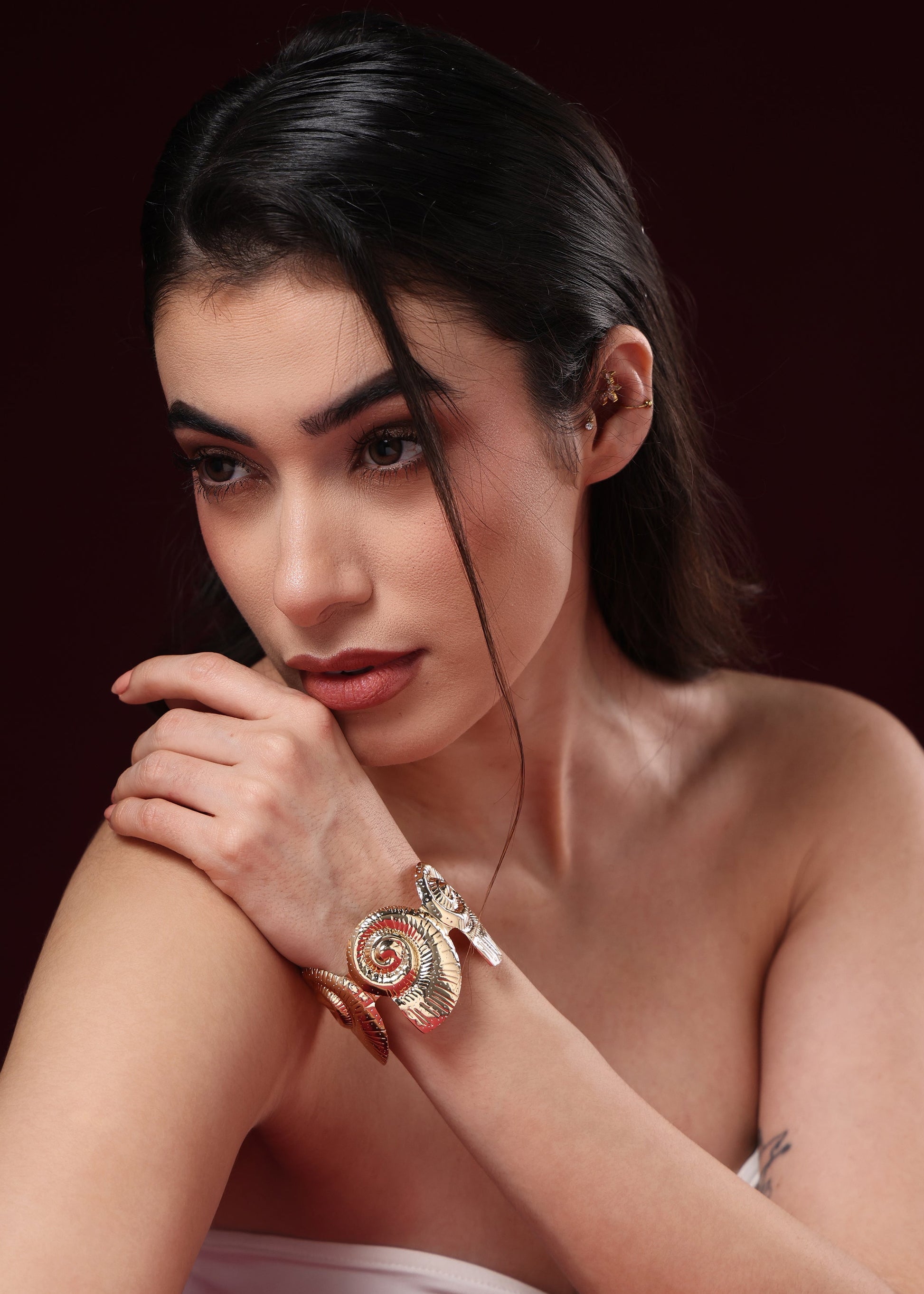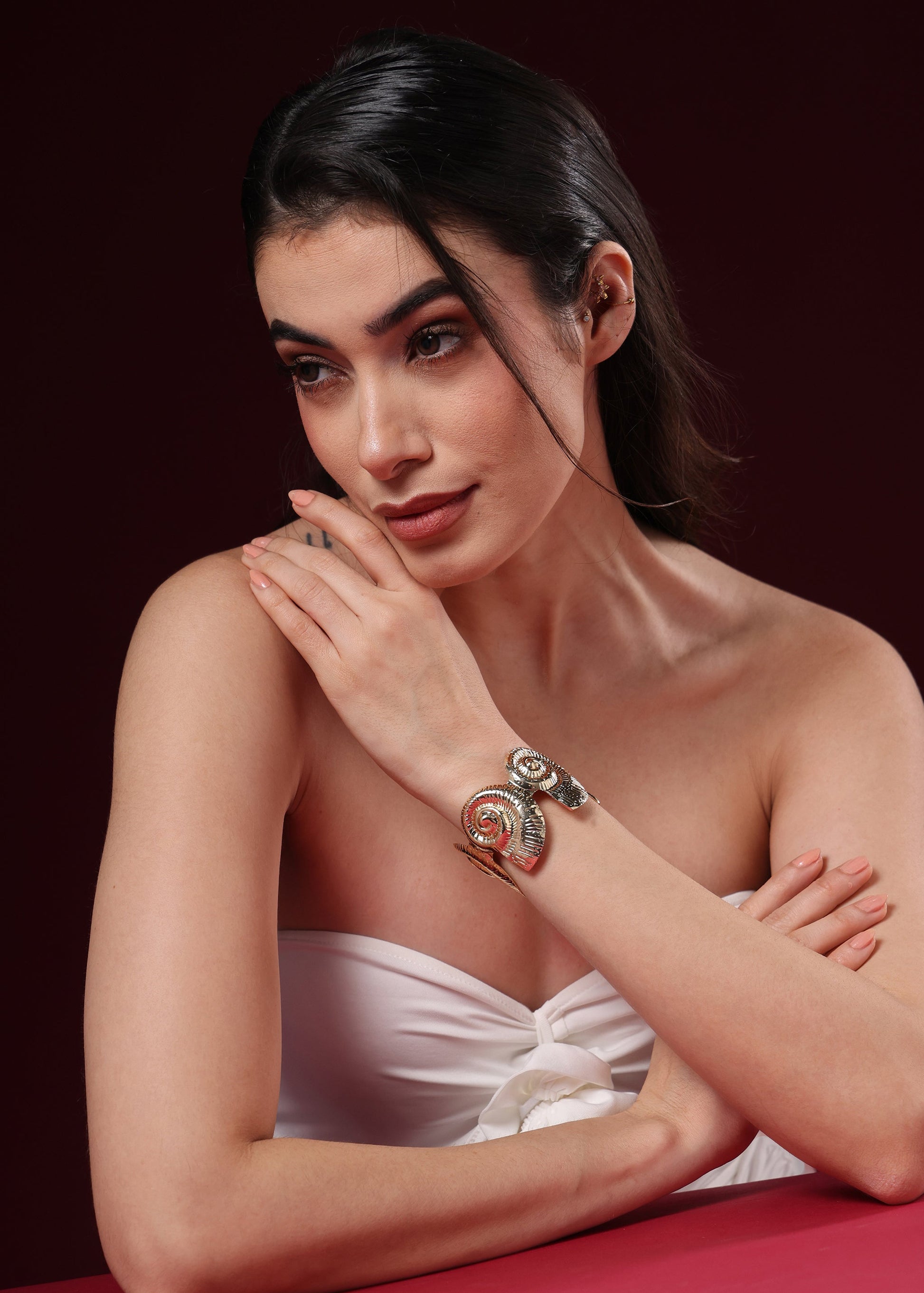 The bold, sculptural wrap-around design serves as a striking centerpiece for any evening ensemble.