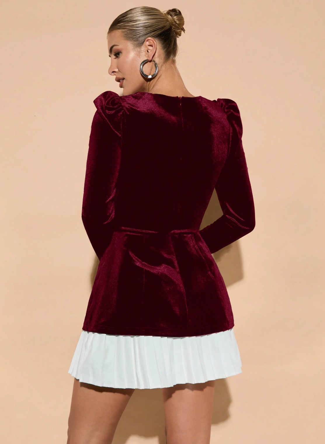A structured velvet top paired with a crisp satin mini skirt — this set is built to stand out without trying hard. The top has a sculpted square neckline and fitted bodice that gives a sharp, elevated silhouette. The satin skirt drops straight down in clean pleats, adding contrast and movement. Together, they create a look that’s bold, polished, and impossible to ignore.