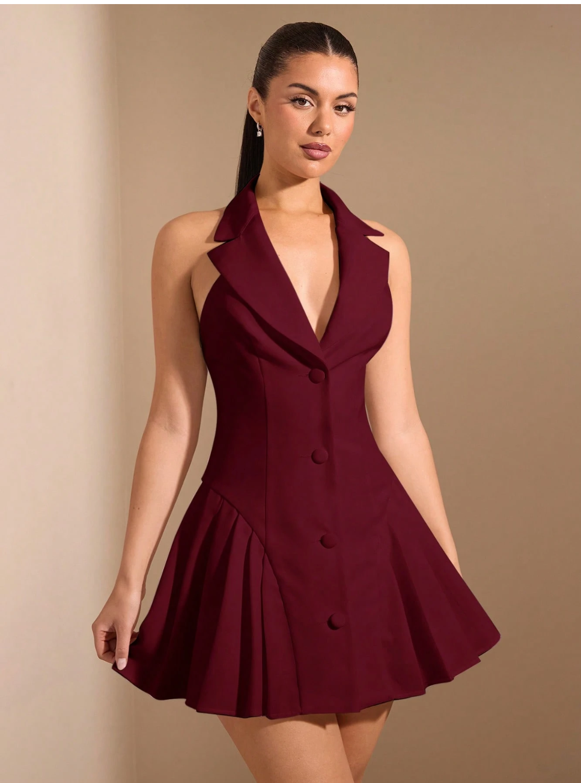 A power move disguised as a party dress. This blazer-inspired mini is cut to frame the shoulders, cinch the waist, and flare out into a sharp, structured hem that gives you instant presence. The deep burgundy tone keeps it rich and polished, while the tailored silhouette makes it impossible to overlook.